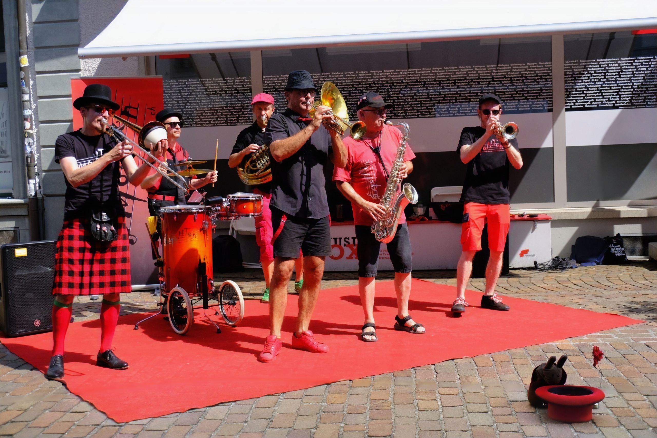 Vor einem Cocktail Drum Kit bauen sich zwei Trompeten, eine Posaune, ein Tenorsax und ein Helikon für Spielfreude gepaart mit Lust am Musizieren auf.